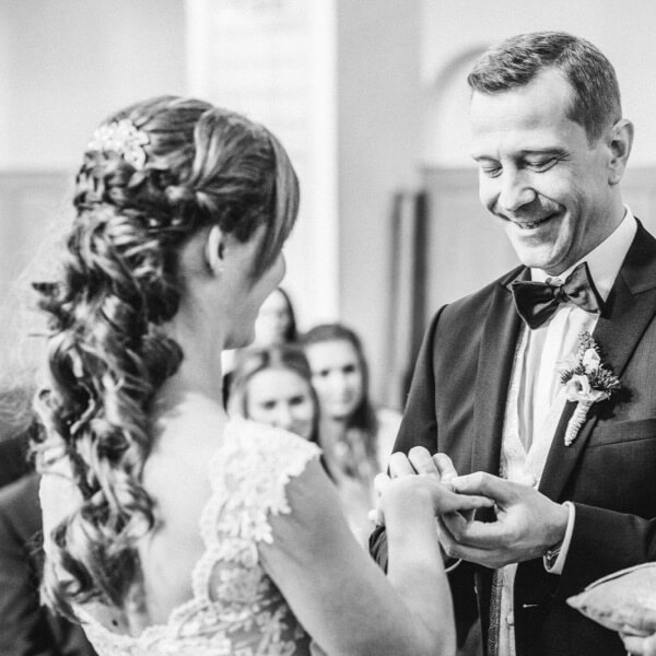 Die ganz besonderen Momente bei der Trauung wie das Ja-Wort, den Ringwechsel und den ersten Kuss als Ehepaar von einem professionellem Hochzeitsfotografen wie mir ergeben wunderschöne Bilder für eine Leinwand oder ein Fotobuch.